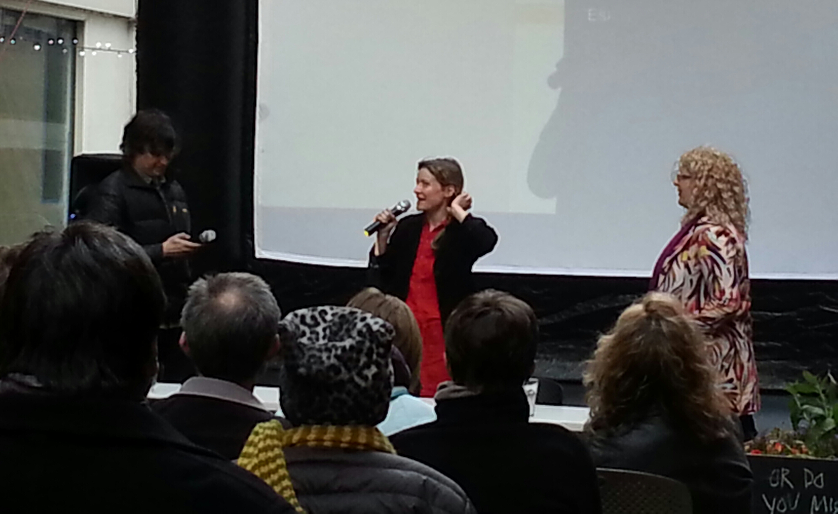 It was a wonderful kick-off to the 3rd Annual San Francisco Green Film Festival! An outdoor, solar-powered screening of “TINY – A Story About Living Small” was enjoyed by a shivering crowd of environmental enthusiasts. The simple plot, one man’s quest to build a small house on wheels, is interspersed with interviews with Tiny House builders and urban planners. The film takes the personal and makes it political by inspiring others to follow the filmmaker’s lead in living off the grid. “Tiny” is suspenseful and beautifully shot. The entertaining film was followed by a Q & A with the filmmakers, Christopher Smith and Merete Mueller. They were later joined by Jay Shafer, interviewed in the film, who drove down from Sonoma County and Chaz Peling from Sol Solutions who provided the solar power for the film. It was a chilly San Francisco evening but judging by the eager questions from the audience, it was clear that reducing our footprint is of much interest, and that many people were already pursuing similar changes in their own lives!