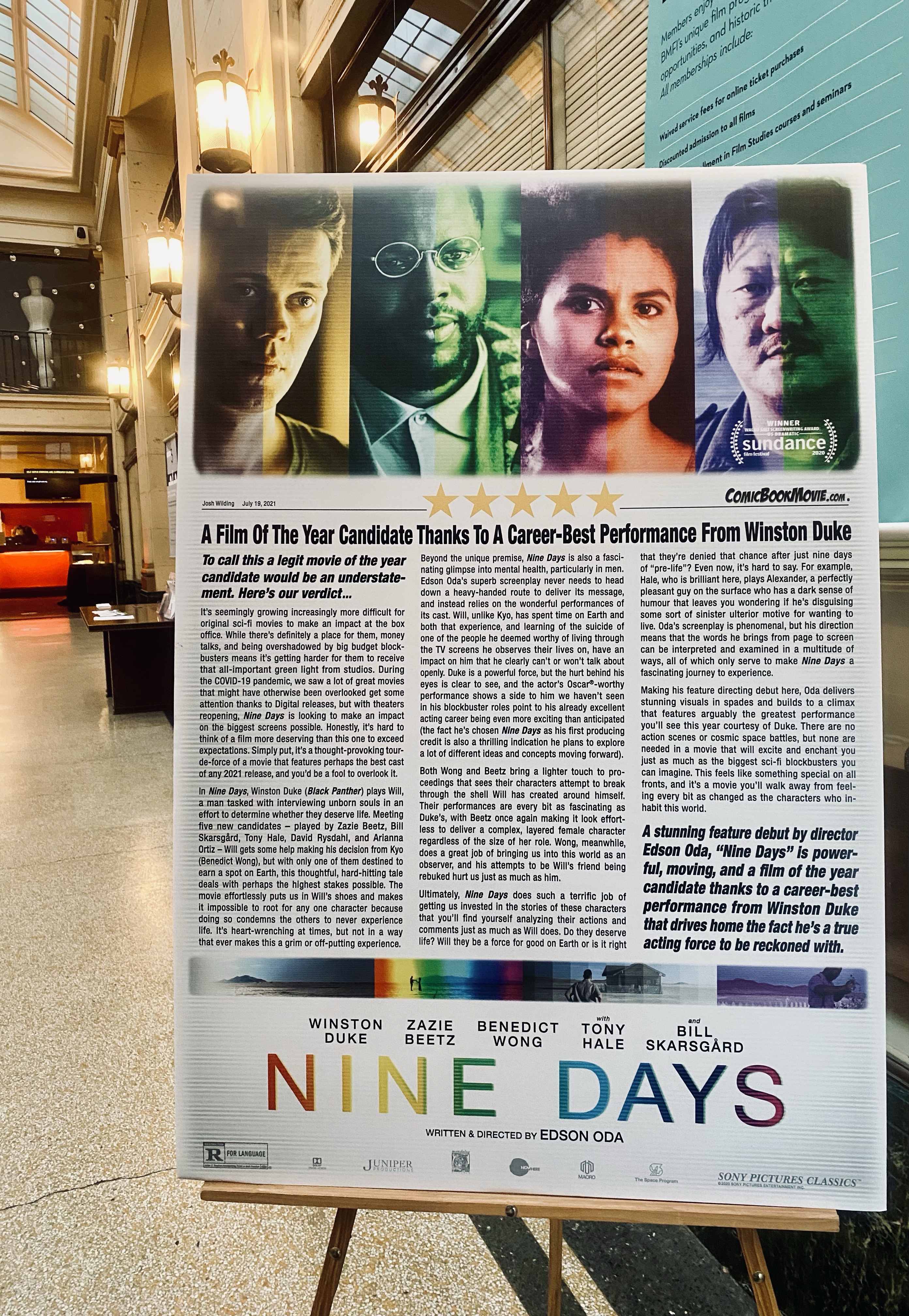 This week I’m scrambling to see a few films before I head off to Telluride for the film festival there. How strange to be struggling to catch up with films from last year’s Sundance Film Festival and new films that just screened at this year’s Cannes Film Festival. All so I can write about them before I’m flooded with new films at my first in-person festival. When I went to my local art house movie theater this week, there was a big poster featuring a review for “Nine Days” in the lobby. Sadly, with limited foot traffic into the theater, I wonder how many people took the time to read it. That’s a shame, because it’s a glowing review from Comic Book Movie dot com. I’ve included it here. Josh Wilding (July 19, 2021) and I are in sync with our praise for this movie.