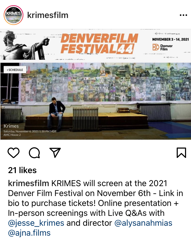 Fortunately, one of my favorite 2021 documentaries, “Krimes” can be seen in person, Nov. 6th and 7th — and on the Eventive Denver Film platform beginning Nov. 4th. Director Alysa Nahmias and artist Jesse Krimes will be there in person for the Q&A session. I had the chance to sit down with director Alysa Nahmias in Philadelphia where the film was screening at the Philly Film Festival.