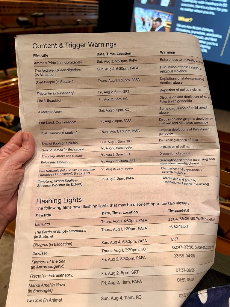 The program listed films that might need a “content & trigger warning”; for content that might be emotionally challenging or of a sexual nature. And a notice about programs that featured strobe lights. There was ASL interpretation for question-and-answer sessions and panels, as well as close captioning for film screenings. Plus, there was a Quiet Room for attendees who might need to decompress between screenings and a parent/lactation room available.